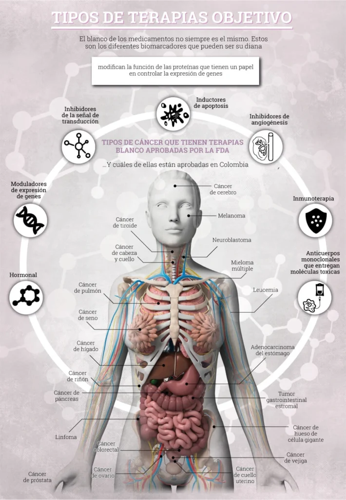 El cáncer no es una sola enfermedad sino que se trata de un conjunto de 200 males. Los tratamientos de precisión, sin embargo, solo se usan para una fracción de estos males porque hasta ahora se han descubierto drogas para los tipos de cáncer que tienen mayor incidencia en el mundo como pulmón, próstata, seno, colon y cáncer gástrico. “En los de menor frecuencia la inversión en la investigación es menor y por eso los avances son más lentos”, dice Cardona. Pero se espera que, en el futuro, todos cuenten con terapias blanco gracias a la secuenciación del genoma tumoral. Cardona explica que si se conoce el 100 por ciento de los genes involucrados en el cáncer se pueden hacer medicamentos para cada uno de ellos.